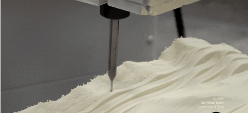 實物的地形模型,用的是耐用又輕巧的聚酯氨泡沫。通過計算機,把「數(shù)字地形模型」的數(shù)據(jù)連到數(shù)控銑床上,高速自轉(zhuǎn)的鉆頭在泡沫上移動,這就是它的切削方式了。